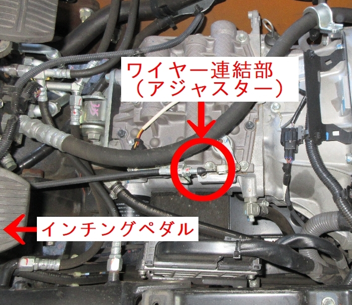 詳しく調べたところ、「インチングペダル」につながるワイヤーの連結部(アジャスター)が錆びていることにより、ワイヤーが動かなくなっていました。