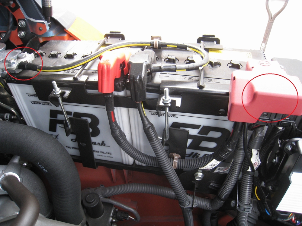 フォークリフトのバッテリーあがりの際に、ブースターケーブルでつないでエンジン始動